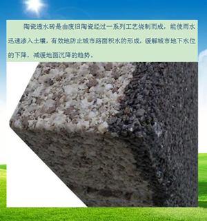 陶瓷透水磚是磚體透水,吸水,快速透水功能,可以防止地下水枯竭,減輕下水道的負擔。防止城市內澇,降低周邊環境溫度,改變熱島效應。另外,由于強大的透水功能,即使下雨走路也不濕鞋,不濺起。
